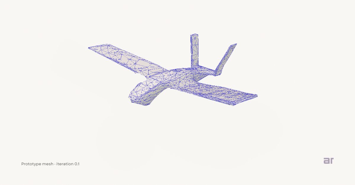 An early digital prototype mesh from ongoing R&D work, rough, incomplete, and constantly changing, showing the structural geometry of an experimental aerospace system.
